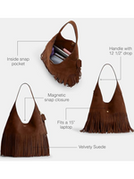 Ideal for work, travel, or everyday use, the Brooklyn Fringe Shoulder Bag holds a 15” laptop, making it the perfect companion for busy lifestyles. The structured yet soft silhouette features a secure magnetic snap closure and an inside snap pocket, ensuring your essentials remain organized and protected.