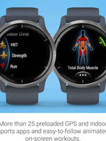 The Garmin Venu 2 GPS Smartwatch combines sleek design with comprehensive fitness and health features. Its 1.3-inch AMOLED display delivers vibrant clarity, while the built-in GPS accurately tracks your outdoor workouts. Monitor your heart rate, sleep patterns, stress levels, and body energy, and benefit from preloaded sports apps for running, cycling, yoga, swimming, and more. Stay connected with smart notifications, including calls, texts, and app alerts, directly on your wrist. Enjoy contactless payments and music playback without needing your phone. The Granite Blue silicone band ensures comfort during long workouts or daily wear. With long-lasting battery life, this smartwatch keeps up with your active lifestyle. Perfect for anyone seeking a GPS smartwatch with advanced health and fitness tracking.