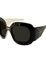 Step into the spotlight with the Gucci GG1093S Hollywood Runway Oversized Wrap Sunglasses, a bold statement piece designed for high fashion and everyday glamour. Featuring a dramatic wrap-around silhouette, these sunglasses showcase a black frame and temples paired with sleek grey lenses for a striking finish.