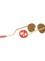 The Gucci Round Sunglasses in Gold with Brown Lenses embody the perfect balance of timeless elegance and modern luxury. With their classic round silhouette, these sunglasses make a refined statement, whether paired with casual attire or elevated evening looks.