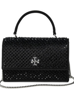Add sparkle to your evening ensemble with the Tory Burch Women's Kira Satin Embellished Mini Top Handle Wallet on Chain – Black. This sophisticated accessory is crafted from luxurious satin and adorned with dazzling allover rhinestone embellishments for an elegant, eye-catching finish.