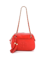 Tory Burch Thea Chain Leather Crossbody Bag – Jasper Color with Gold Hardware, Fabric Lining, and Zip Closure