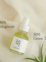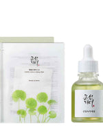 The sheet mask contains 15% Centella Asiatica to promote skin regeneration and soothe irritation, while the serum blends 50% Green Tea, 30% Mugwort, and 5% Panthenol for a triple-action effect: calming inflammation, hydrating deeply, and reinforcing the skin barrier.
