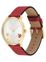 The Coach Elliot Women’s 2H Quartz Watch blends minimalism with playful luxury, making it a standout accessory for both weekday wear and weekend style. Designed with a 36mm gold-tone round case, the watch is completed with a rich red calfskin strap that offers comfort, durability, and a polished finish. Its silver white dial features polished dome markers, sparkling crystals, and a unique floating pattern of signature Coach charms, highlighted by a crush-red heart accented with the Coach Signature. Powered by dependable quartz movement, it ensures consistent accuracy with low maintenance. With 3 ATM water resistance, it withstands splashes and everyday exposure to moisture. Crafted with attention to detail, this watch is an elegant gifting choice for someone who loves timeless design with a touch of character.