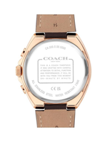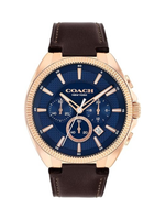 The Coach Jackson Men's Chronograph Watch combines sophisticated style with rugged functionality, perfect for everyday wear. This 45mm rose gold ionic-plated stainless steel case features a navy dial with three subdials for hours, minutes, and seconds, along with a convenient date window. The watch is paired with a dark brown calfskin leather strap, providing comfort and a premium finish for all occasions. Powered by quartz chronograph movement, it offers precise timekeeping and stopwatch functionality, with a sweep second hand that can be started, stopped, and reset easily. Water-resistant up to 30 meters (3 ATM), the Jackson withstands splashes and brief immersion in water. Designed with meticulous attention to quality and detail, this versatile timepiece is ideal for professional, casual, or semi-formal settings, making it a stylish gift for men who value classic design and everyday practicality.
