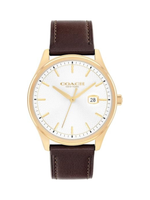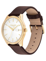 The Coach Oliver Men's Quartz Watch blends timeless style with refined functionality. This 41mm thin gold ionic-plated stainless steel case watch features a white textured dial with stately stick markers and a magnified date window at 3 o’clock, offering both elegance and practicality. The brown calfskin leather strap provides a comfortable and sophisticated fit for daily wear. Powered by quartz movement, it delivers precise, reliable timekeeping with minimal maintenance. Water-resistant up to 50 meters (5 ATM), the Oliver withstands brief immersion or splashes, making it suitable for everyday use. Crafted with meticulous attention to detail, this watch is perfect for professional, casual, or semi-formal occasions and makes an excellent gift for men who appreciate classic design, durability, and understated luxury.