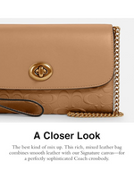 The Coach Signature Leather Chain Crossbody is the ultimate fusion of elegant design and practical functionality. Crafted from a rich combination of embossed and smooth leather, this compact crossbody bag exudes timeless sophistication. Perfect for the modern woman on the move, it features a sleek turnlock closure, 10 credit card slots, a full-length bill compartment, an interior zip pocket, and an exterior slip pocket to keep essentials organized and secure. The detachable long strap (22" drop) offers versatile styling, easily transforming from a shoulder bag to a crossbody, while the detachable wrist strap provides an additional carry option. Measuring 8" L x 5" H x 3/4" W, the bag is compact yet offers well-designed storage for cards, cash, and a phone. Available in classic Black and soft Taupe, it stands as a sophisticated statement piece perfect for everyday wear or elegant occasions.