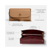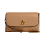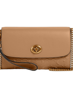 The Coach Signature Leather Chain Crossbody is the ultimate fusion of elegant design and practical functionality. Crafted from a rich combination of embossed and smooth leather, this compact crossbody bag exudes timeless sophistication. Perfect for the modern woman on the move, it features a sleek turnlock closure, 10 credit card slots, a full-length bill compartment, an interior zip pocket, and an exterior slip pocket to keep essentials organized and secure. The detachable long strap (22" drop) offers versatile styling, easily transforming from a shoulder bag to a crossbody, while the detachable wrist strap provides an additional carry option. Measuring 8" L x 5" H x 3/4" W, the bag is compact yet offers well-designed storage for cards, cash, and a phone. Available in classic Black and soft Taupe, it stands as a sophisticated statement piece perfect for everyday wear or elegant occasions.