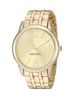 The Nine West Women’s Gold-Tone Bracelet Watch combines classic elegance with modern design, making it a versatile accessory for daily wear. Its round champagne sunray dial is accented with oversized Arabic numerals and stick hour markers, offering excellent readability while maintaining a refined aesthetic.