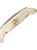 The 39mm gold-tone case delivers a confident wrist presence, protected by a durable mineral crystal lens that helps resist everyday scratches. Complementing the case is a five-link gold-tone bracelet, designed for comfort and security, and finished with a fold-over clasp with double push-button safety.