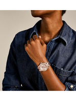 A rose gold stainless steel bracelet with a secure fold-over clasp ensures a comfortable and customizable fit, making it ideal for both casual looks and dressier occasions. With 100-meter water resistance, the Fossil Riley is suitable for swimming, bathing, and snorkeling—perfect for women who want style without compromise.