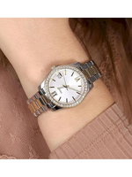 Designed for the stylish go-getter, the Fossil Women’s Scarlette Mini Quartz Stainless Steel Watch blends sporty elegance with timeless sophistication. This refined 32mm timepiece features a polished two-tone stainless steel case with a luminous silver sunray dial, accented by Roman numerals at the 12 and 6 o’clock positions. A fluted top ring adds a subtle touch of luxury, while the precise quartz three-hand movement with date display ensures reliable everyday performance. The adjustable silver and gold-tone stainless steel bracelet offers a comfortable, customized fit. Finished with a scratch-resistant mineral crystal and water resistance up to 50 meters, the Scarlette Mini transitions effortlessly from day to night—making it a versatile statement piece for modern wardrobes.