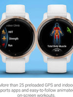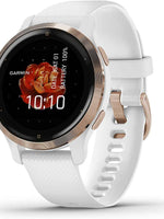 The Garmin Venu 2S with a Rose Gold bezel and white silicone band is designed for those who want advanced health and fitness insights in a smaller, elegant smartwatch. Featuring a bright AMOLED display and a slim 40mm case, it blends fashion with powerful functionality. With built-in GPS, 25+ sports apps, and animated on-screen workouts, it’s ideal for everyday training and wellness. The Venu 2S provides advanced health metrics including Body Battery™, Pulse Ox, stress tracking, respiration, sleep score, women’s health tracking, and fitness age. The Health Snapshot™ feature lets you log a 2-minute session to capture vital stats like heart rate, blood oxygen, respiration, and stress. Stay connected with smart notifications, music storage (8GB), and Bluetooth® connectivity. With up to 10 days of battery life in smartwatch mode, the Garmin Venu 2S is your perfect all-day companion.