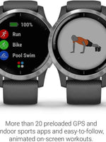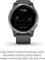 Garmin vivoactive 4 GPS Smartwatch – Music, Body Energy Monitoring, Animated Workouts, Pulse Ox, Silver with Gray Band