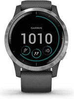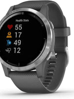 Elevate your fitness and wellness journey with the Garmin vivoactive 4 GPS Smartwatch in Silver with Gray Band. This round smartwatch features a 1.3-inch display and Garmin OS for smooth navigation. With built-in GPS, track your runs, walks, and outdoor activities with precision. Advanced health metrics include Body Energy Monitoring, Pulse Ox, stress tracking, and sleep analysis, giving you a comprehensive view of your well-being. Enjoy music on the go with internal storage and Bluetooth connectivity. The smartwatch also offers animated workouts to guide you through strength, cardio, yoga, and Pilates sessions. Lightweight yet durable, the vivoactive 4 is perfect for active lifestyles and everyday wear. With multiple size and color options, it combines style, functionality, and premium Garmin technology in one wearable device.