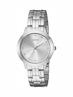 Embrace understated sophistication with the GUESS Classic Slim Stainless Steel Bracelet Watch (Model: U0989L1). This 30mm silver-tone timepiece showcases a polished stainless-steel case and bracelet, exuding effortless elegance for both everyday wear and special occasions. The silver-tone dial with sleek hour markers and a second-hand feature enhances readability while maintaining a clean, minimalist look. Crafted with a durable mineral crystal, it resists scratches and maintains clarity over time. Powered by reliable quartz analog movement and water resistant up to 30 meters, this watch perfectly balances beauty and practicality—making it an ideal choice for the modern woman with timeless taste.