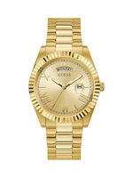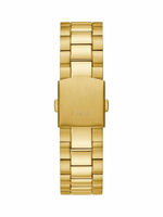 The GUESS Gold-Tone Analog Watch embodies refined sophistication and classic style. Crafted with a 42mm brushed and polished stainless steel case, this elegant timepiece features a champagne gold-tone dial with a day-of-the-week display at 12 o’clock and a bubble date window at 3 o’clock. Its three-link bracelet and coin-edge bezel enhance the watch’s luxurious character, while the mineral glass crystal ensures durability and lasting clarity. Designed with a double-locking foldover clasp, it provides both comfort and security. With water resistance up to 50 meters (165 feet), this watch is suitable for daily wear and light recreation. Perfect for the modern gentleman, this GUESS timepiece combines functionality with timeless gold-tone elegance.