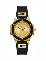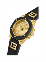 GUESS Ladies 38mm Two-Tone Watch | Black Silicone Strap & Champagne Dial