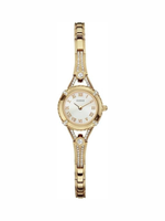 Graceful and radiant, the GUESS Petite Gold-Tone Crystal Bracelet Watch embodies modern femininity with a classic touch. This elegant timepiece features a 22mm polished gold-tone case embellished with subtle crystal accents that add just the right amount of sparkle. The white dial is enhanced by gold-tone Roman numerals, offering a refined balance of clarity and charm. Its crystal-embellished bracelet with self-adjustable links ensures a comfortable, customized fit. Protected by a durable mineral crystal, this petite watch is as resilient as it is beautiful. With quartz analog precision and water resistance up to 10 meters, it’s the perfect companion for both everyday sophistication and evening elegance.