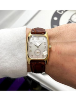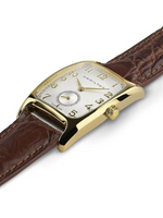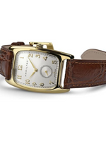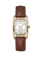 Embrace timeless sophistication with the Hamilton American Classic Boulton Quartz Watch. This Swiss-made timepiece features a sleek 27mm x 31.6mm yellow PVD stainless steel case paired with a refined white analog dial, exuding understated elegance. Powered by a reliable Swiss Quartz movement, it offers precision and minimal maintenance, ideal for everyday wear or special occasions. The supple brown leather strap complements the classic design, secured by a pin buckle for lasting comfort. With a slim profile of 7.8mm thickness and a mineral crystal for durability, this watch offers subtle luxury without excess. Water-resistant up to 30 meters, it withstands daily wear challenges. Backed by a 2-year international warranty, the Hamilton Boulton Quartz Watch is the perfect accessory for those seeking a blend of heritage, functionality, and timeless style.