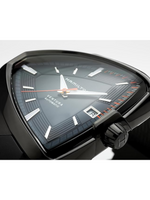 Celebrate legendary design and Swiss craftsmanship with the Hamilton Ventura Elvis80 Automatic Watch. Inspired by the iconic Ventura heritage, this striking timepiece stands out with its futuristic black PVD stainless steel case measuring 42.5mm x 44.6mm, delivering a bold yet elegant presence. The deep black analog dial provides exceptional contrast for readability, while the open case back reveals the mechanical artistry of the Swiss automatic movement. The robust black rubber strap offers sporty durability and all-day comfort, secured by a pin buckle. The scratch-resistant sapphire crystal with antireflective coating protects the dial, ensuring long-term clarity and performance. Water-resistant up to 50 meters, the Ventura Elvis80 is perfect for daily wear with a touch of avant-garde style. Backed by a 2-year international warranty, this timepiece blends iconic design, mechanical precision, and lasting performance for those who dare to stand out.