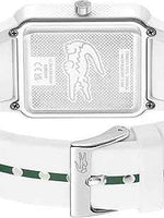 The white TR90 composite and stainless steel case frames a clean white dial, accented with the Lacoste logo and polished indexes. A matching tonal silicone strap delivers comfort and durability for everyday wear. The quartz movement ensures precise timekeeping, while the mineral crystal glass protects the watch face from scratches.