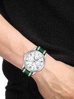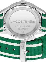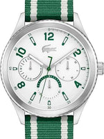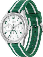 The Lacoste Deuce Men’s Quartz Chronograph Watch combines bold design with eco-conscious innovation. Featuring a 44mm case and bezel crafted from over 75% recycled stainless steel, and a dial and woven strap made from ocean-bound plastic, this timepiece reflects Lacoste’s commitment to sustainability without compromising on style. The white dial with Arabic numeral indexes is complemented by chronograph sub-dials for day, date, and 24-hour timekeeping, ensuring versatile functionality for everyday wear. A durable mineral crystal protects the display, while the green strap printed with the Lacoste logo adds a sporty edge. Powered by precise quartz multifunction movement, this watch offers reliable performance with minimal maintenance. Water resistant up to 50 meters (5 ATM), the Deuce is as durable as it is stylish, making it the ideal choice for the modern, responsible man.
