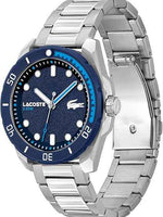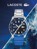 The grained dial features a mix of color-filled circular and stick indexes, accented by the iconic Lacoste crocodile logo. Bright pop-color details on the dial and bezel add a modern, energetic twist.