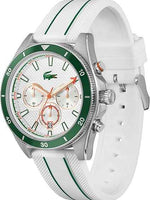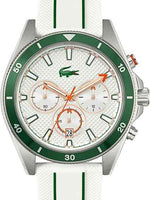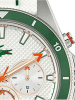 Set sail in style with the Lacoste Mainsail Men’s Chronograph Watch – White, a contemporary sports watch inspired by nautical elegance. The 43mm stainless steel case houses a crisp white dial accented with vibrant detailing, sunray-finished sub-dials, and the signature Lacoste crocodile logo. A colored aluminum insert on the coinage bezel adds a refined touch, while the chronograph movement offers stopwatch functionality combined with precise timekeeping.