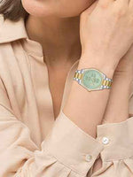 Sage crystal dial adds a refined and luminous touch