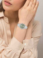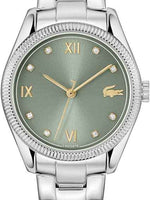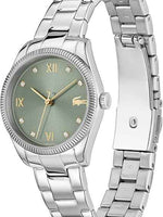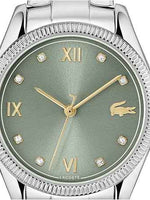 The green sunray dial adds depth and vibrancy, accentuated with Roman numerals and sparkling crystal indexes for a touch of feminine luxury. The signature Lacoste crocodile logo sits proudly on the dial, a nod to the brand’s sporty-luxury heritage.