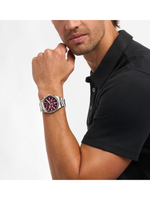 The silver stainless-steel bracelet features a textured beveled design and removable links for a tailored fit, while the scratch-resistant mineral crystal ensures durability in daily wear. With water resistance up to 100m, this watch is suitable for swimming, snorkeling, and everyday style. A refined mix of performance and personality—perfect for men who prefer modern luxury with a strong visual edge.