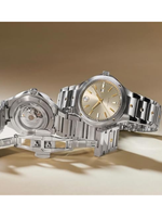 The Movado S.E. Automatic Women’s Sport Watch combines precision engineering with elevated modern luxury. Designed for women who value heritage craftsmanship and contemporary style, this 33mm stainless steel timepiece is powered by natural wrist movement and showcases its automatic 608A caliber through a striking exhibition caseback. The grey Pavés de Paris dial features date display, Super-LumiNova markers and the iconic Movado dot at 12 o’clock, enhanced with yellow-gold PVD accents for refined contrast. Built with 10 ATM water resistance, it withstands daily wear, swimming and active routines while maintaining sophisticated presence. Bold yet elegant, this self-winding watch is a signature piece for the modern woman — a wearable fusion of art, luxury and performance.