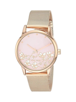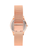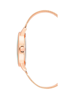 Rose gold-tone hands and hour markers provide clean readability, while the dial is protected by a domed mineral crystal lens that adds visual depth and everyday durability. The streamlined case pairs beautifully with the rose gold-tone mesh bracelet, delivering a lightweight and refined feel on the wrist.