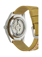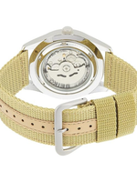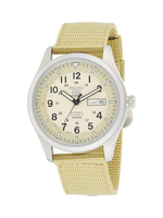 The Seiko 5 SNZG07J1 delivers dependable performance and classic field-watch aesthetics in a versatile package. Powered by the in-house 7S36 automatic movement, this self-winding watch runs without batteries and offers around 40 hours power reserve. Its broad 42 mm stainless-steel case, protected by durable Hardlex crystal, pairs with a rugged beige fabric strap for a comfortable, utilitarian feel. The beige dial with luminous hands and markers ensures excellent readability — day or night — while the day-date display at 3 o’clock adds practical functionality. With 100 m water resistance, SNZG07J1 is ready for daily wear, light swimming, and outdoor use. A reliable, stylish choice for men who want classic mechanical watch heritage with everyday durability.