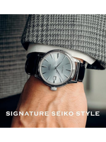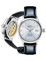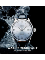 The Seiko Presage Cocktail Time Automatic Men’s Watch blends traditional Japanese craftsmanship with elegant, modern styling. Featuring a beautifully textured patterned silver dial accented with golden numerals, this timepiece captures the sophistication of Seiko’s renowned Cocktail Time series. Powered by the dependable 4R35 automatic movement with a 41-hour power reserve, it delivers reliable accuracy without the need for batteries. A durable stainless-steel case, paired with a sleek black leather strap, creates a timeless look suitable for both business and evening wear. With 50m water resistance and a practical date calendar, it offers everyday functionality wrapped in luxury design. A perfect choice for men who appreciate refined style and mechanical precision.