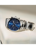 Inspired by mid-century architecture, the Fossil Men’s Neutra Quartz Stainless Steel Chronograph Watch delivers timeless design with modern functionality. Featuring a bold 44mm round stainless steel case, this big-face men’s watch showcases a striking blue sunray dial accented with silver-tone Roman numerals and stick indices for refined readability. Powered by a precise quartz chronograph movement, it includes stopwatch functionality and a date window for everyday practicality. The durable stainless steel bracelet offers a polished look with a secure fold-over clasp and adjustable links for a customized fit. Protected by a scratch-resistant mineral crystal and water-resistant up to 50 meters, the Neutra chronograph transitions seamlessly from professional settings to casual wear—making it a versatile statement piece for the modern gentleman.