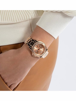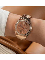 Rose gold-tone multifunction dial for day, date, or 24-hour display.