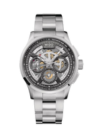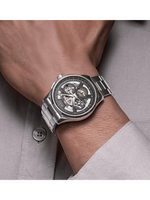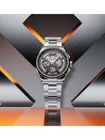The 43 mm stainless-steel case is robust yet refined, capable of withstanding pressures up to 10 bar (100 m/330 ft), and features a screw-down crown for enhanced security. A sapphire crystal with double-sided anti-reflective coating ensures clarity and durability, while the transparent exhibition case back allows a view of the mechanical movement in action. The watch is completed with a stainless-steel bracelet with folding clasp for comfort and secure fit, with 22 mm band width and 14.4 mm case thickness.
