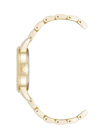 Elevate your everyday style with the Nine West Women’s Bracelet Watch in Pink/Gold, a refined timepiece designed for effortless elegance. This watch features a beautifully textured pink sunray dial paired with white-filled gold-tone hands and markers for enhanced readability. The coin-edge textured bezel and durable mineral crystal lens add a polished, premium finish. A gold-tone adjustable link bracelet with a fold-over clasp and double push-button safety closure ensures a secure and comfortable fit. Lightweight and versatile, this bracelet watch transitions seamlessly from daytime wear to evening occasions. Ideal for casual, work, or dressy looks, it’s a stylish accessory that adds a touch of color and sophistication. While not water resistant, its elegant design makes it perfect for everyday fashion wear.