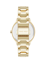 The Nine West Women’s Gold/Black Bracelet Watch delivers classic sophistication with subtle sparkle. Designed with a 33mm gold-tone case, this elegant timepiece features a black textured dial accented by white-filled gold-tone hands, Arabic numerals, and genuine crystal-accented hour markers for a touch of luxury.