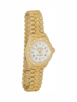 The Pre-Loved Rolex Diamond 18K Gold Bark Datejust President 69288 26mm is a masterpiece of elegance and Swiss watchmaking. Crafted in 18K yellow gold with a distinctive bark-finished Oyster case, this ladies’ timepiece features a natural-cut diamond bezel and a refined white dial with Roman numerals, complemented by a magnified Cyclops date window. Powered by Rolex’s self-winding automatic movement with quickset date, it offers both precision and reliability. The iconic President bracelet with hidden clasp ensures comfort while maintaining a luxurious aesthetic. Presented in excellent pre-loved condition, including branded box and papers, this 26 mm Datejust President is the perfect blend of sophistication, heritage, and lasting investment value for collectors and style enthusiasts alike.