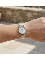 The Timex Women’s Easy Reader 25mm Watch blends timeless design with everyday comfort and reliability. Designed for effortless readability, it features a bright white dial with bold black full Arabic numerals, making time telling quick and easy. The 25mm two-tone brass case paired with a self-adjustable stainless steel expansion band offers a secure and comfortable fit for wrists up to 7.5 inches—no clasp required. Timex’s signature INDIGLO® light-up dial ensures clear visibility in low-light and nighttime conditions. Protected by a durable mineral glass crystal, this classic analog watch is water resistant up to 30 meters, making it suitable for daily wear and light splashes. Elegant yet practical, the Timex Easy Reader is perfect for work, casual outings, and everyday use.