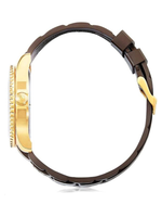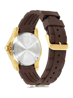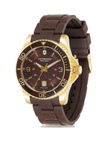 The Victorinox Swiss Army Maverick GS Men’s Watch (241608) delivers a striking combination of sportiness and Swiss precision. Its round gold-tone stainless steel case is complemented by a brown dial with luminous hands for clear readability in any light. The matching brown bezel and embossed rubber strap create a bold, versatile design suitable for both active and casual wear.