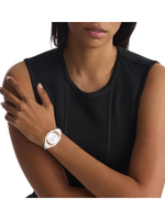 The Calvin Klein CK Elation Women’s Quartz Watch combines artistic design with understated luxury. Featuring a sculpted, minimalistic bangle that gracefully tapers around the wrist, this timepiece offers a distinctive silhouette with subtle open-space accents that reveal a hint of the wearer’s wrist. The two-tone stainless-steel and rose gold case pairs beautifully with a silver sunray dial, creating a luminous, sophisticated aesthetic. Powered by precise quartz movement, it ensures reliable, low-maintenance timekeeping for everyday wear. The durable mineral crystal protects against scratches, preserving clarity and shine. Ideal as a premium gift for her, this Calvin Klein watch is a modern, stylish accessory that enhances both casual and elegant outfits while reflecting exceptional craftsmanship.