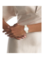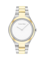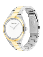 The Calvin Klein Ladies’ Timeless Beauty Quartz Watch is designed for women who appreciate subtle refinement and modern luxury. Featuring a sophisticated round case with an elongated bezel, this 36 mm timepiece elevates any look with its glossy minimalistic dial and crystal-adorned case opening. The two-tone stainless-steel bracelet complements the light gold dial, creating a polished aesthetic that transitions seamlessly from day to night. Powered by precise quartz movement, it offers reliable and low-maintenance performance for everyday wear. The mineral crystal lens provides durable scratch resistance, ensuring lasting clarity and shine. Thoughtfully crafted with Calvin Klein’s signature minimalism, this watch is a timeless accessory and a thoughtful gift for her that blends elegance, quality, and contemporary style.