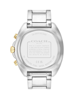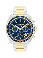 The Coach Charter Men's Quartz Chronograph Watch is a versatile, sporty timepiece designed for men with an active lifestyle. Featuring a 44.5mm two-tone stainless steel case and bracelet, this watch boasts a blue lacquer dial with sleek stick markers, a tachymeter bezel, and a date window, along with three subdials for hours, minutes, and seconds. Powered by quartz chronograph movement, it combines stopwatch functionality with precise timekeeping, offering reliability and performance. Water-resistant up to 30 meters (3 ATM), it withstands splashes or brief immersion in water, making it ideal for daily wear. Crafted with meticulous attention to quality, function, and detail, the Coach Charter watch is a perfect accessory for sporty, professional, or casual occasions, and a thoughtful gift for men who value style and practicality.