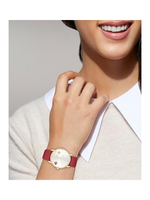 The Coach Elliot Women’s 2H Quartz Watch blends minimalism with playful luxury, making it a standout accessory for both weekday wear and weekend style. Designed with a 36mm gold-tone round case, the watch is completed with a rich red calfskin strap that offers comfort, durability, and a polished finish. Its silver white dial features polished dome markers, sparkling crystals, and a unique floating pattern of signature Coach charms, highlighted by a crush-red heart accented with the Coach Signature. Powered by dependable quartz movement, it ensures consistent accuracy with low maintenance. With 3 ATM water resistance, it withstands splashes and everyday exposure to moisture. Crafted with attention to detail, this watch is an elegant gifting choice for someone who loves timeless design with a touch of character.
