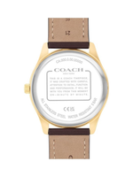 The Coach Oliver Men's Quartz Watch blends timeless style with refined functionality. This 41mm thin gold ionic-plated stainless steel case watch features a white textured dial with stately stick markers and a magnified date window at 3 o’clock, offering both elegance and practicality. The brown calfskin leather strap provides a comfortable and sophisticated fit for daily wear. Powered by quartz movement, it delivers precise, reliable timekeeping with minimal maintenance. Water-resistant up to 50 meters (5 ATM), the Oliver withstands brief immersion or splashes, making it suitable for everyday use. Crafted with meticulous attention to detail, this watch is perfect for professional, casual, or semi-formal occasions and makes an excellent gift for men who appreciate classic design, durability, and understated luxury.