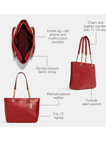 Boasting generous dimensions of 12 1/2" (L) x 10 1/2" (H) x 4 3/4" (W), the Cammie Chain Tote offers ample space to stow your daily essentials securely with a top zip closure. Thoughtfully designed with an inside zip pocket, cell phone pocket, and multifunction compartments, your organization is effortless, while four protective feet provide durability on any surface.